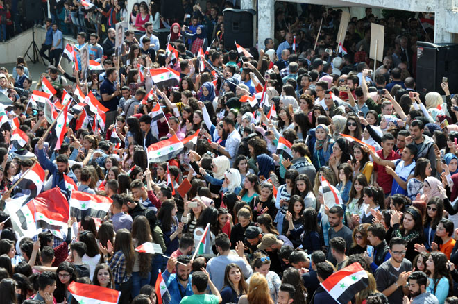 Lattaquié/ Les étudiants et les fonctionnaires de l’Université de Tichrine à Lattaquié ont observé aujourd’hui deux sit-in en signe de solidarité avec les héros de l’armée arabe syrienne qui protègent la patrie et de refuse de l’agression tripartie contre la Syrie.