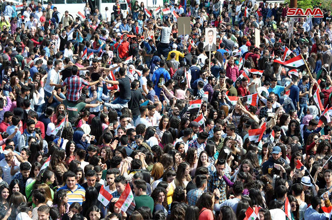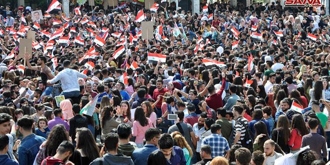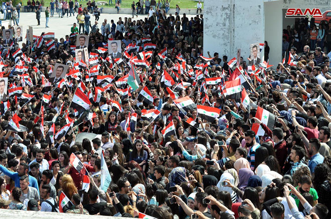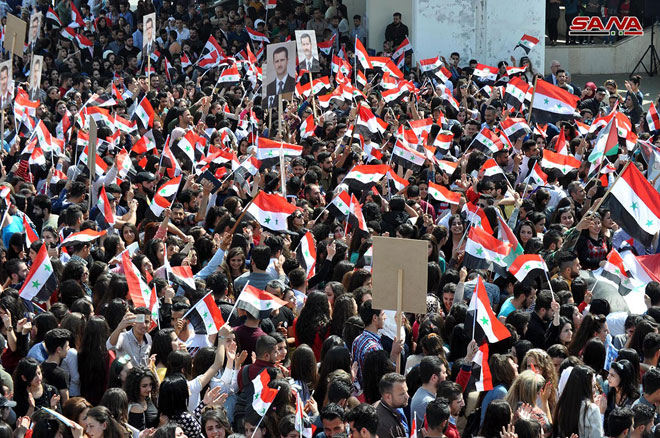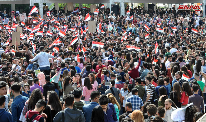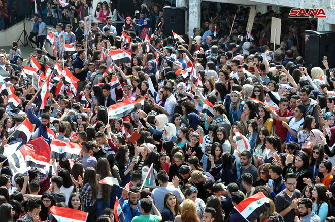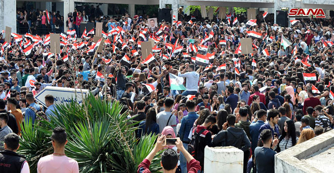 16/04/2018 Rassemblement populaire à l’Université de Tichrine en signe de soutien aux victoires de l’armée arabe syrienne et en condamnation de l’agression tripartie contre la Syrie 2018-04-16 dima Share tweet