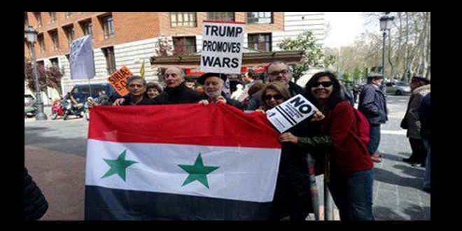 Les manifestants, qui s’étaient rassemblés à l’invitation de l’établissement ‘’la Plateforme mondiale anti-guerres’’ et sous le titre “Non à l’agression impérialiste contre la Syrie”, ont condamné l’agression militaire unilatérale qui a été menée par Washington, Paris et Londres contre la Syrie qui est un Etat souverain et membre aux Nations Unies.