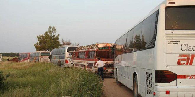 Le correspondant de guerre de SANA dans les environs du camp de Yarmouk a dit que 5 autobus, transportant à bord 200 terroristes avec leurs familles, étaient sortis à un point à proximité du rond-point de Battikha après les avoir, précisément, fouillés en crainte du trafic par les terroristes des explosifs et des charges explosives dans les bagages.