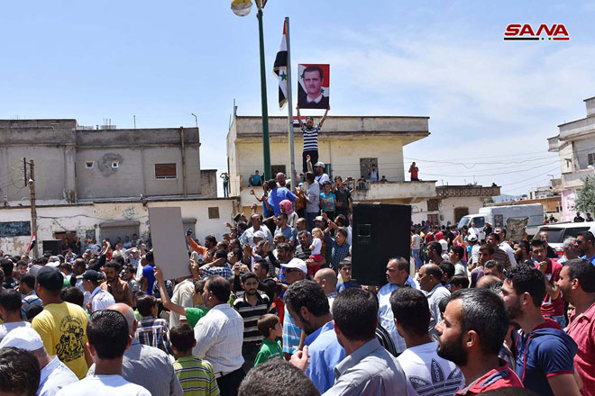 Les habitants ont reçu aujourd’hui les unités des forces de sécurité intérieure en hissant des drapeaux nationaux et des photos du président Bachar al-Assad.