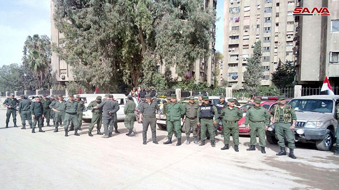 Damas / Des unités des forces de sécurité intérieure sont entrées aujourd’hui les deux zones de Hajar Aswad et du camp de Yarmouk au sud de Damas pour y renforcer la sécurité et la stabilité, quelques heures après leur libération du terrorisme.
