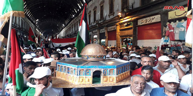 Damas/ En commémoration de la journée mondiale d’al-Qods et sous le titre”Nous prions ensemble pour al-Qods”, une marche imposante a été organisée aujourd’hui à partir de l’entrée de Souk Hamidiya vers la mosquée des Omeyyades à Damas.