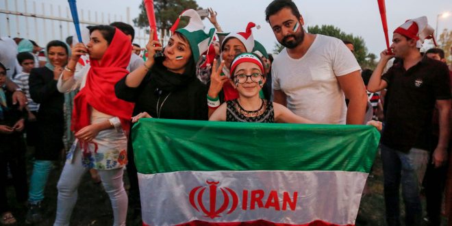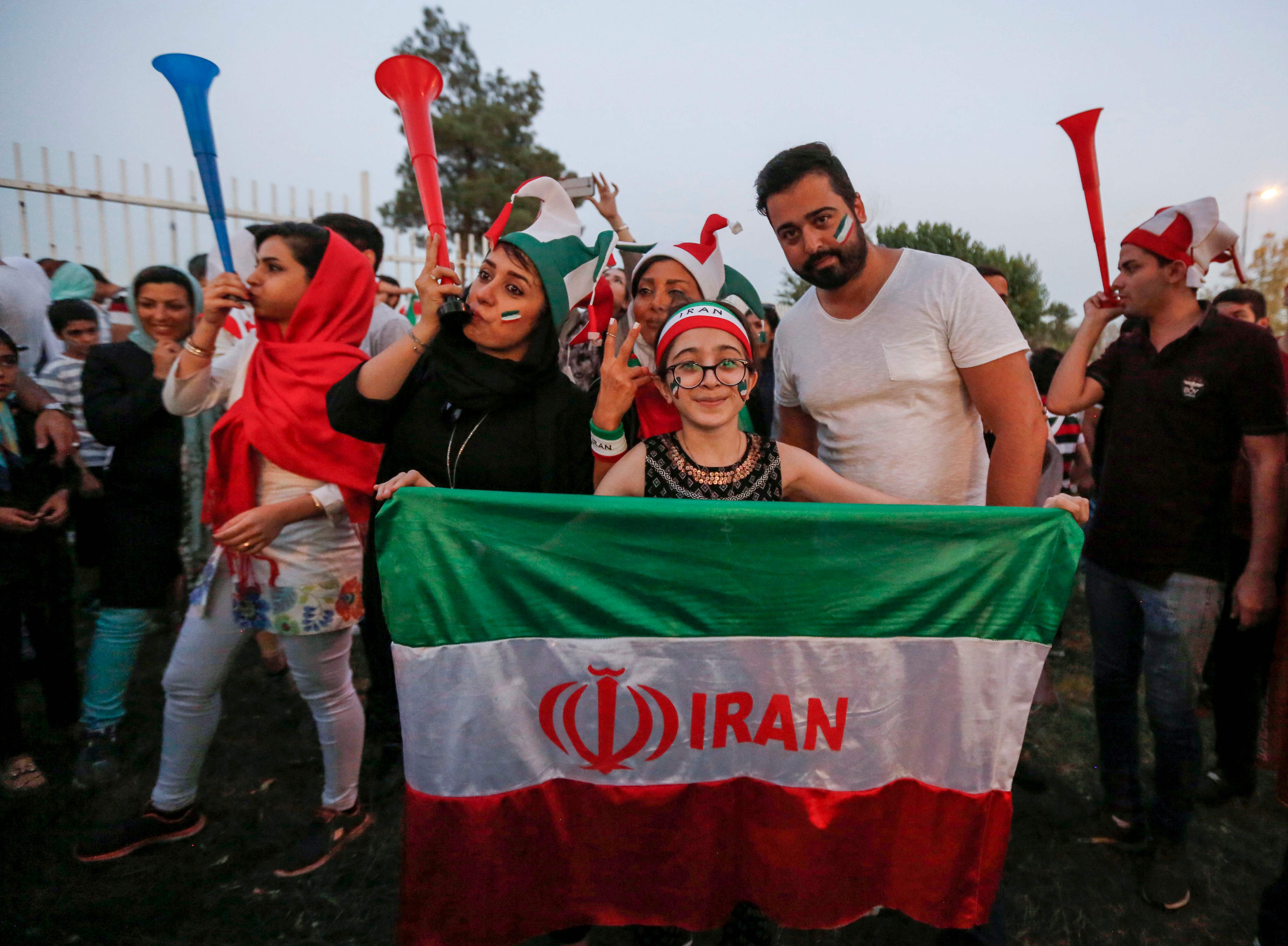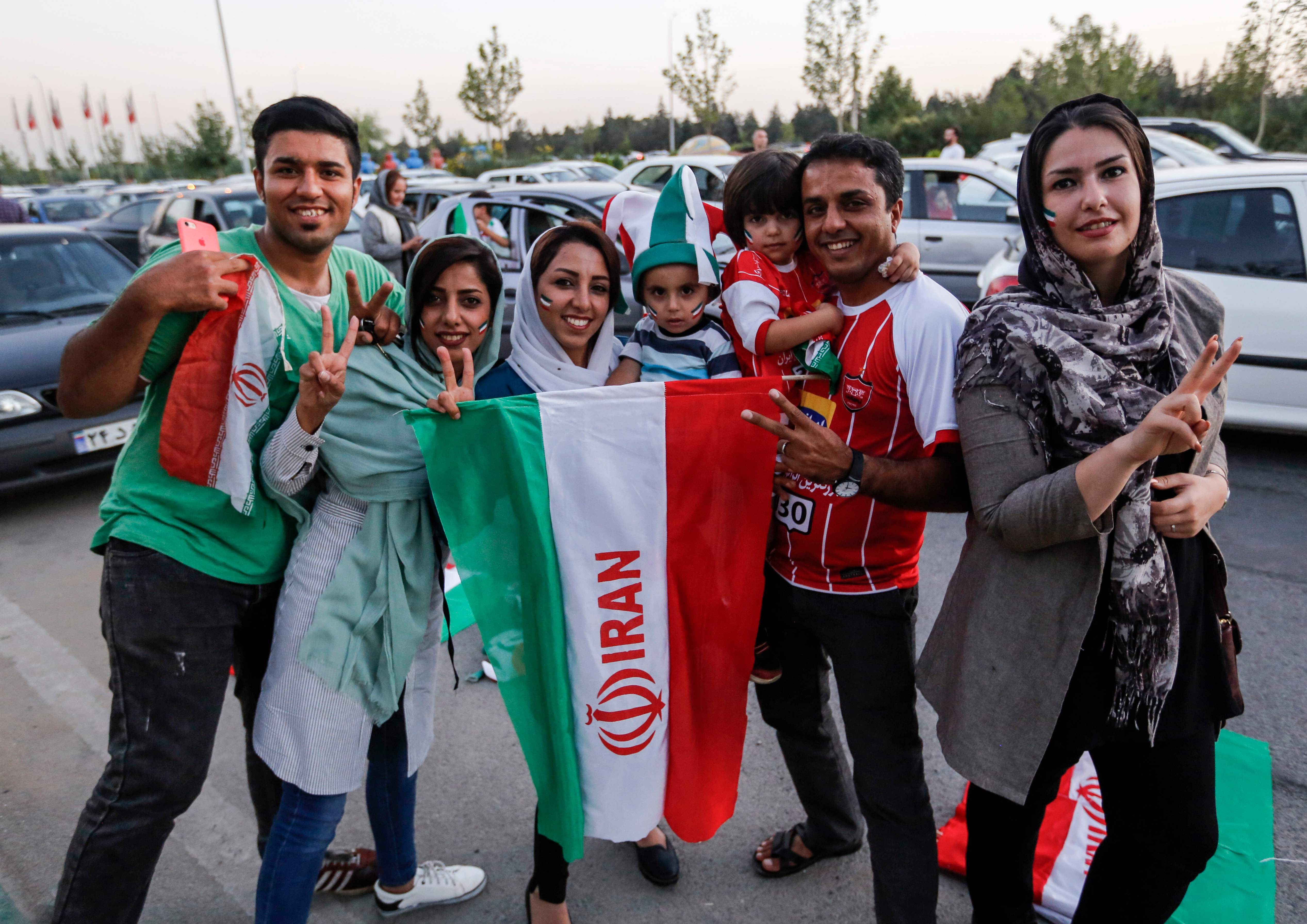 Iranian football supporters dressed in their national team’s colours and paraphernalia pose with a national flag as they arrive outside Azadi stadium in the capital Tehran on June 20, 2018, to attend a screening of the Russia 2018 World Cup Group B football match between Iran and Spain. / AFP / ATTA KENARE