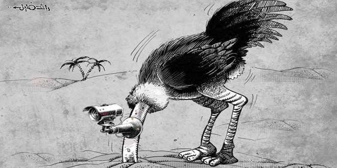 Le tableau de l’artiste Khalil raconte la culture de la crainte en reflétant cette situation par une caméra de surveillance mise sur le cou de l’autruche qui met normalement la tête dans le sable lorsque le danger se produit. L’image porte des connotations et diverses projections.