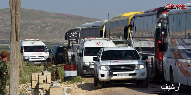 Le correspondant de Sana à Alep a indiqué que 90 autobus et ambulances étaient entrés dans les deux localités pour transporter les habitants assiégés par les réseaux terroristes depuis 3 ans, et ce en exécution de l’accord proclamé hier et qui prévoit la libération de toutes les personnes enlevées dans le village d’Ichtabreq et des habitants assiégés à Kefraya et Fou’a.