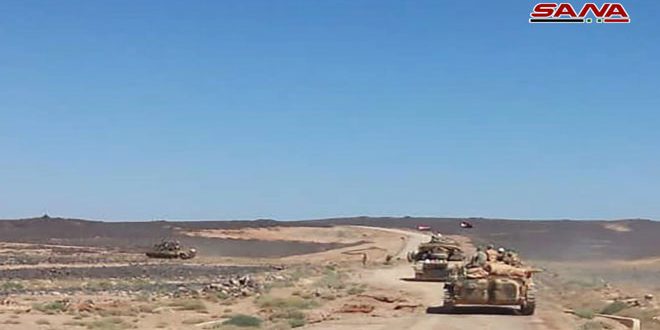 Soueidaa/L’armée syrienne, avec la coopération des forces alliées, a réalisé aujourd’hui une nouvelle progression dans le désert de Soueidaa et resserre l’étau sur les terroristes du réseau Daech qui se déploient sur les collines de Safaa dans le désert de Soueidaa, dans le cadre de ses opérations qui se poursuivent pour la libération de la banlieue est du gouvernorat du terrorisme.