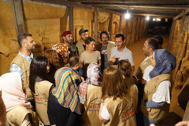 Damas / Le président Bachar al-Assad et Mme Asma al-Assad ont visité aujourd’hui un tunnel que les terroristes avaient creusé à Jobar et que 18 artistes syriens avaient transformé en un lieu pour l’art et la créativité.