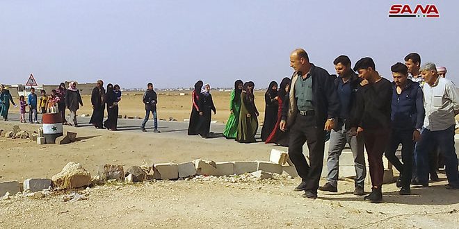 Idleb/Des dizaines de familles déplacées en raison du terrorisme ont traversé aujourd’hui le corridor d’Abou Dhouhour dans la banlieue sud-est d’Idleb, pour regagner ensuite leurs maisons dans les banlieues d’Alep, de Hama et d’Idleb.