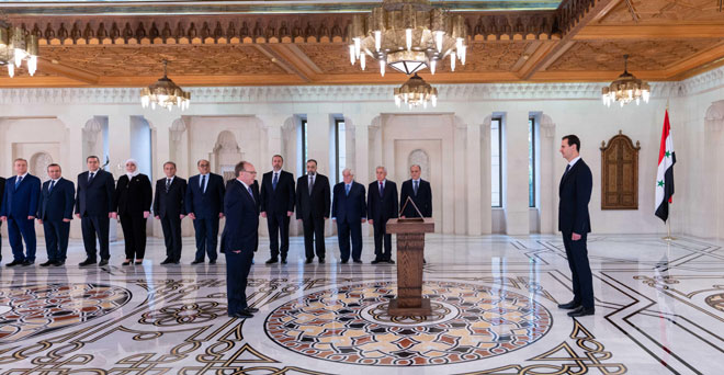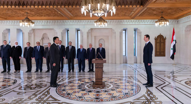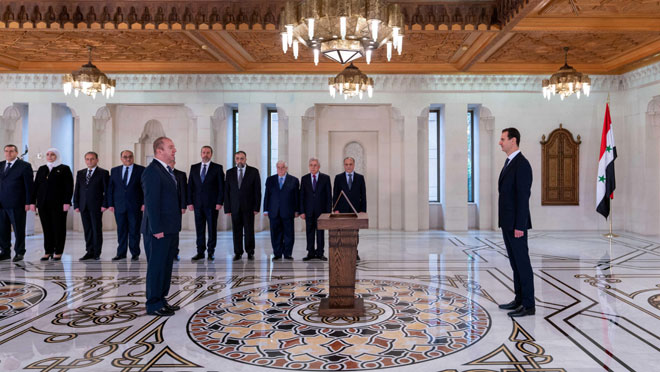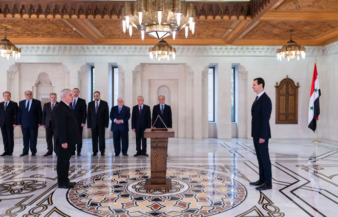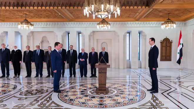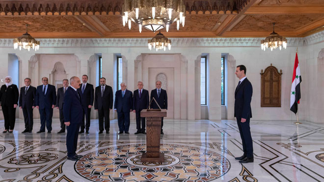 Damas / Devant le président Bachar al-Assad, le général Mohammad Khaled al-Rahmoun, ministre de l’Intérieur, Mohammad Rami Redhwan Martini, ministre du Tourisme, Imad Mwafaq al-Azeb, ministre de l’Education, Bassam Bachir Ibrahim, ministre de l’Enseignement supérieur, Suheil Mohammad Abdullatif, ministre des Travaux publics et de l’Habitat, Iyad Mohammad al-Khattib, ministre des Télécoms et de la Technologie et Mohammad Maan Zein al-Abidine, ministre de l’Industrie, ont prêté serment constitutionnel.