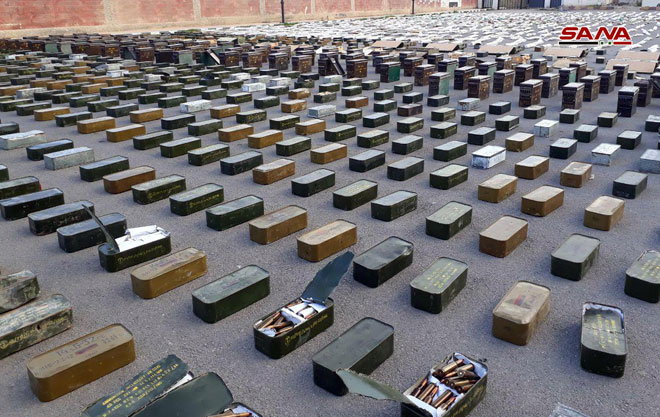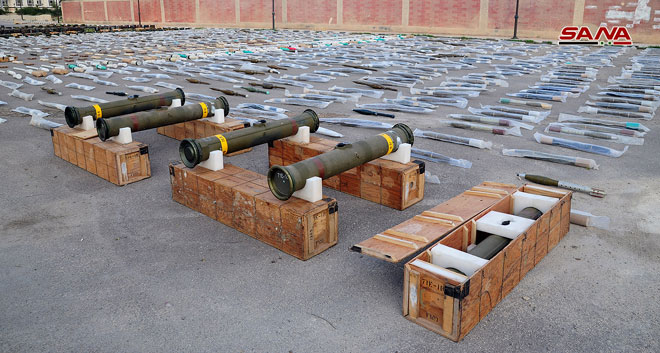 Région sud-SANA/ Les services compétents ont découvert, alors qu’ils continuaient à ratisser les zones libérés par l’armée arabe syrienne du terrorisme, de grandes quantités d’armes et de munitions, dont des missiles de fabrication américaine, abandonnées par les terroristes dans la région sud.