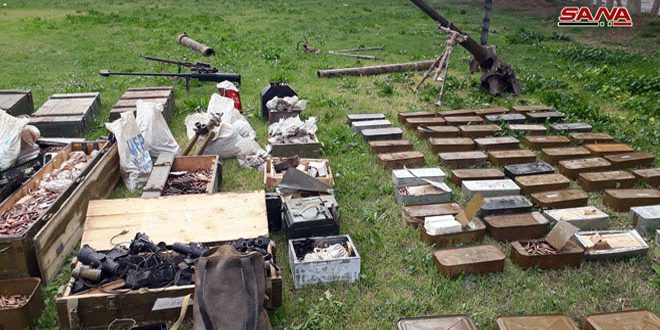 Homs-Sana/ Les services compétents ont saisi des quantités d’armes et de munitions abandonnées par les terroristes dans le village de Kafrlaha dans la banlieue nord de Homs, selon le correspondant de SANA à Homs.