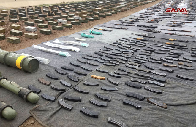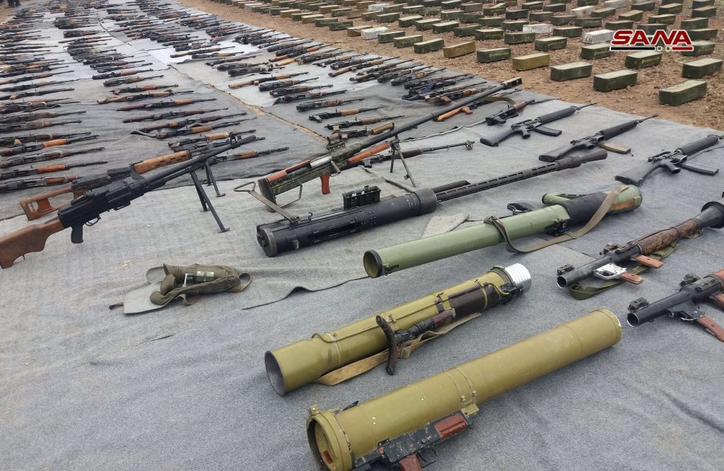 Banlieue de Damas – SANA/ Les services compétents ont saisi des armes et des médicaments de fabrication israélienne et américaine, alors qu’ils ratissaient les zones libérées du terrorisme dans les deux banlieues sud-ouest de Damas et nord de Quneitra.