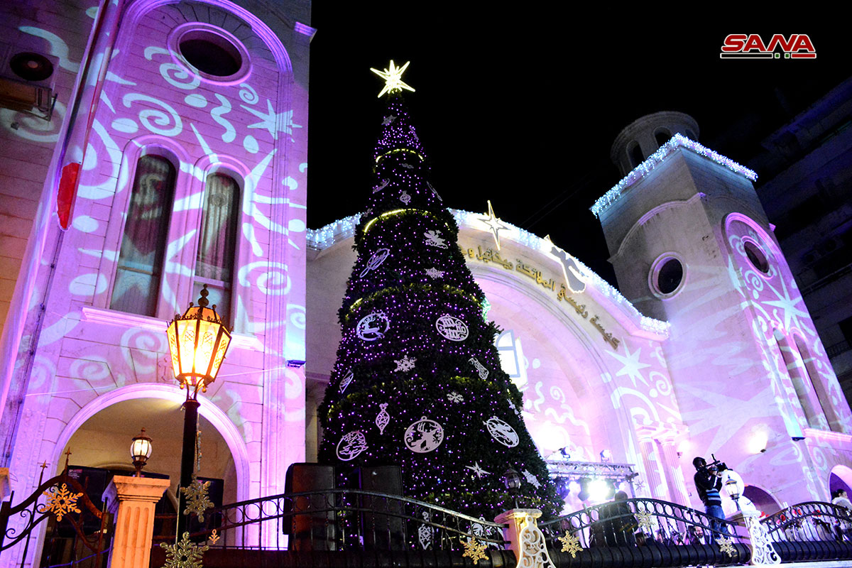 Lattaquié / A l’occasion des fêtes de Noël, les confessions chrétiennes ont illuminé aujourd’hui le sapin de Noël devant l’église des Archanges Michel et Gabriel, dans le quartier d’al-Amirkan dans la ville de Lattaquié.
