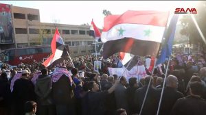 Des habitants du gouvernorat, dont certains appartiennent aux villages se trouvant à l’est du fleuve de l’Euphrate, se sont rassemblés en hissant des drapeaux de la patrie et des photos du président Bachar al-Assad, scandant des slogans de condamnation de l’agression truque contre les territoires syriens.