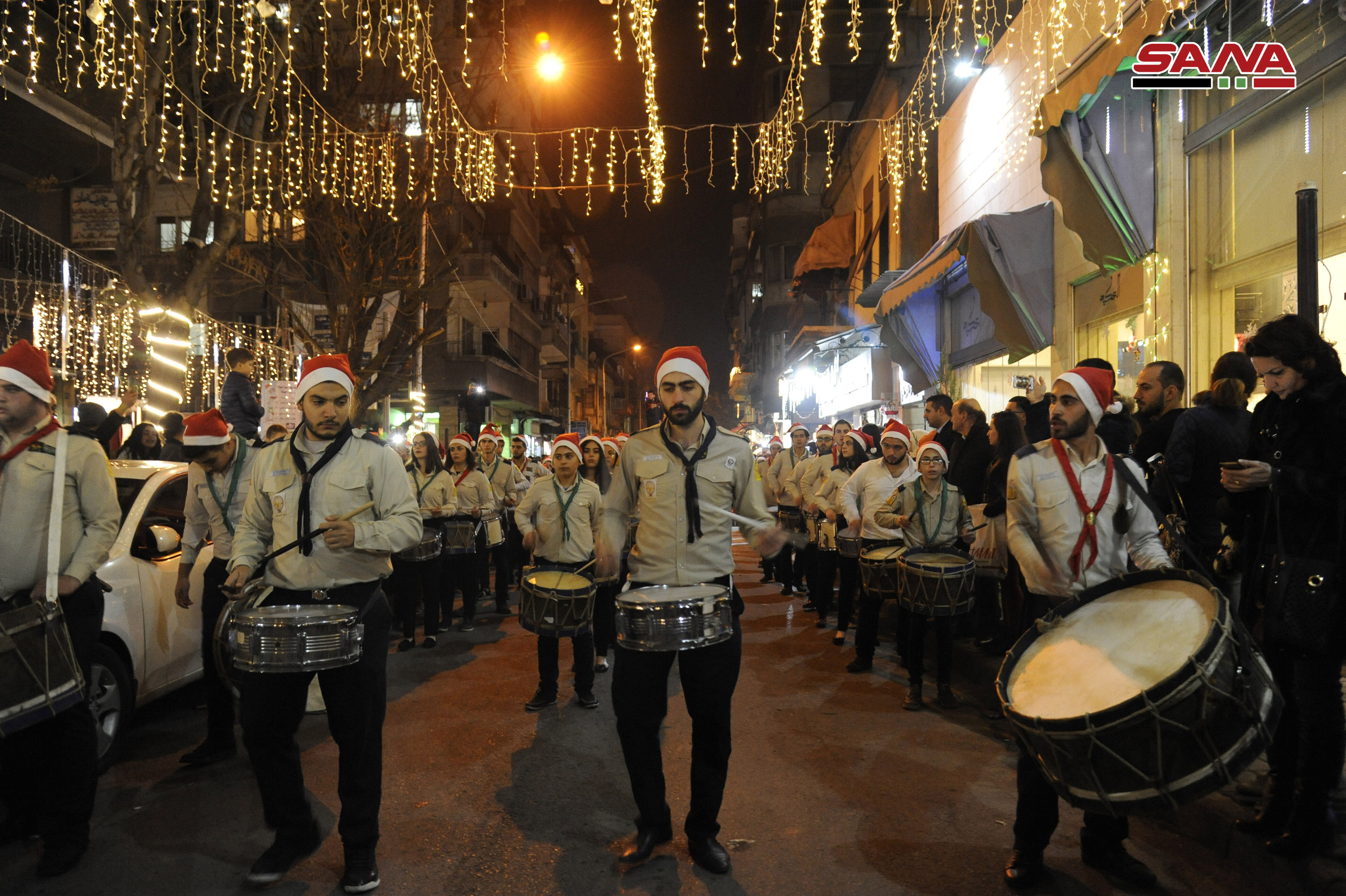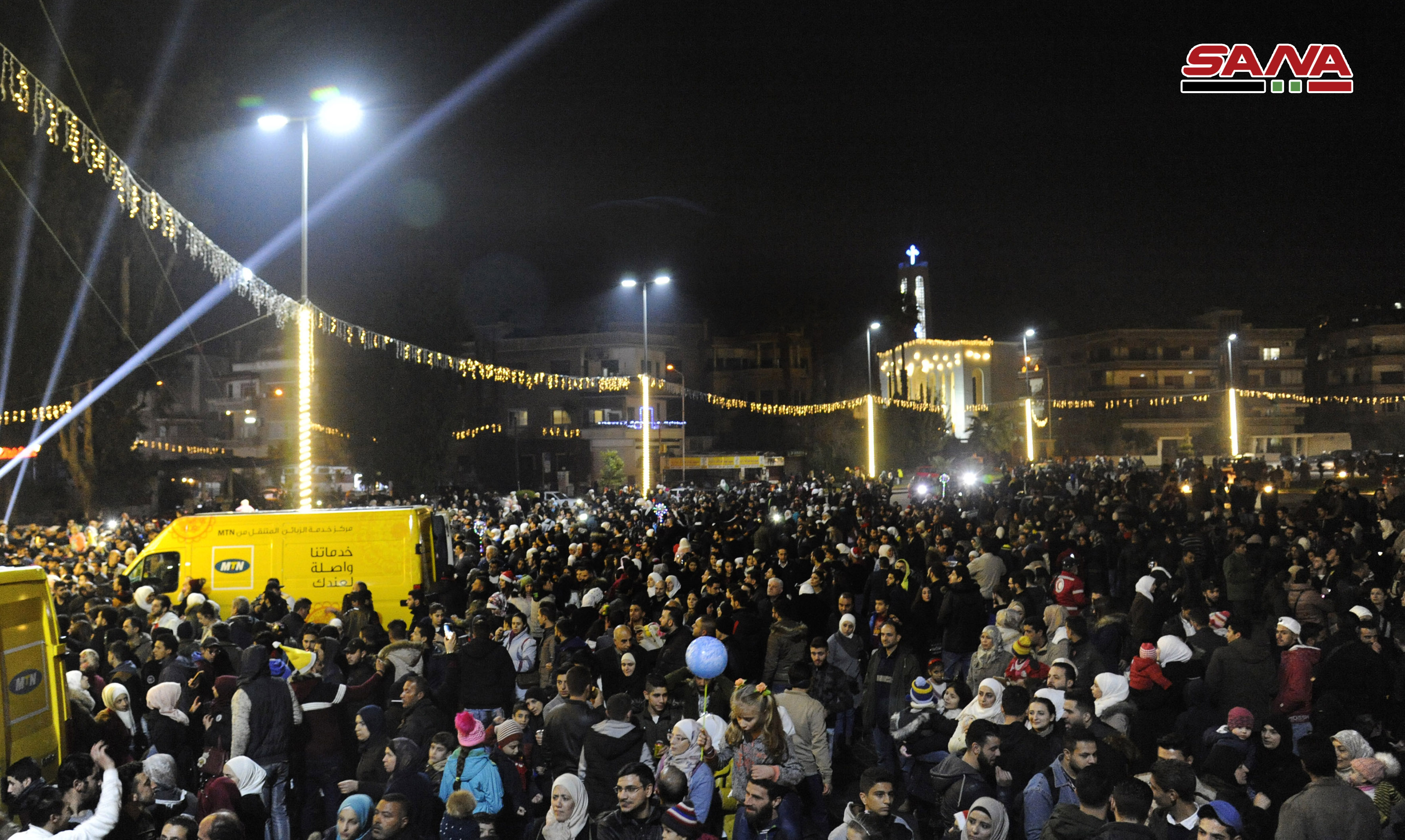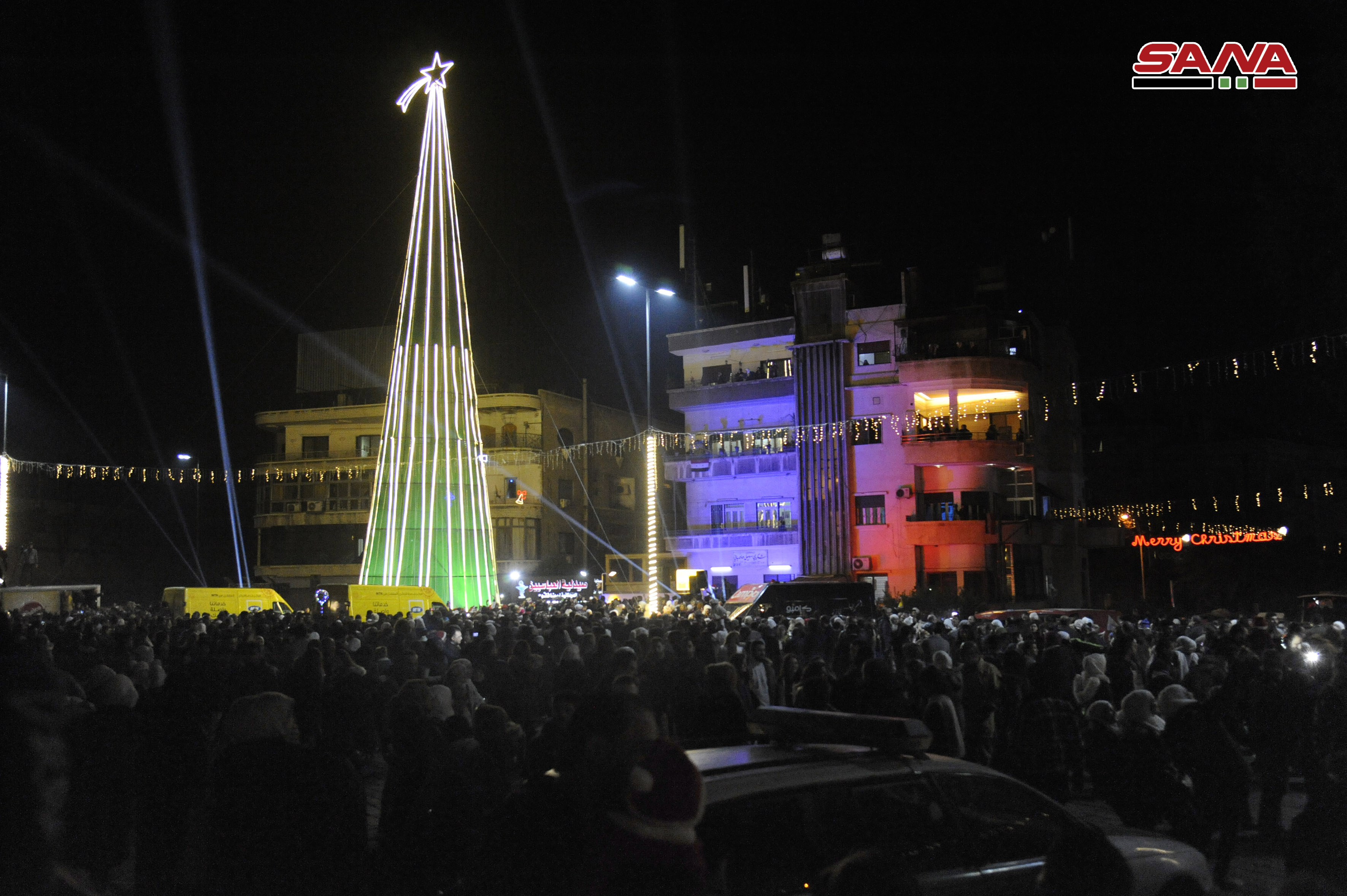 Damas-SANA / A l’occasion des fêtes de Noël et de Nouvel an, le projet « Action » a organisé le « Carnaval de Noël » qui a inclus l’illumination du plus haut sapin de Noël dans la ville de Damas, dont la hauteur atteint 30 mètres, sur la place d’al-Abbassiyne à Damas.