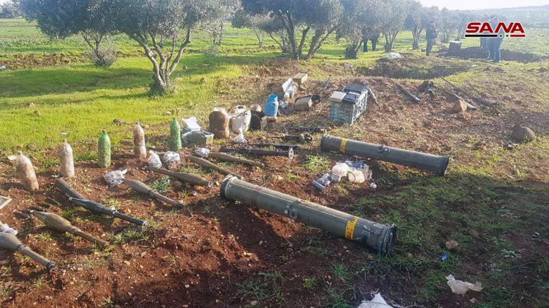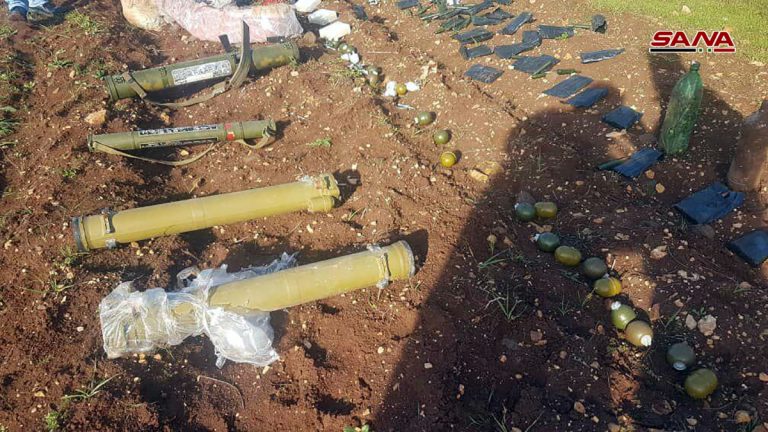 Découverte d’armes et de munitions, dont des missiles « TOW » de fabrication américaine, abandonnées par les terroristes dans le village de Tell Dahab dans la banlieue de Homs