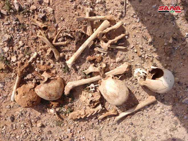 Homs-SANA / Les services compétents ont découvert à Amrya dans la périphérie de Palmyre une fosse commune contenant les dépouilles de nombre de martyrs, dont des enfants, exécutés par les terroristes de « Daech » avant son expulsion par l’armée arabe syrienne.