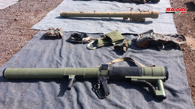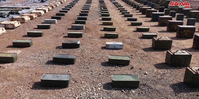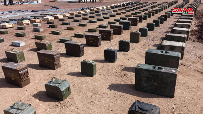 Quneitra – SANA/ Dans leurs opérations de ratissage menées dans les zones qui ont été libérées par l’armée arabe syrienne du terrorisme dans les deux banlieues de Quneitra et du sud-ouest de Damas, afin d’éliminer les résidus des terroriste et de protéger la vie des civiles, des unités de génie ont découvert en collaboration avec les habitants, de grandes quantités d’armes, de munitions, de médicaments, d’équipements médicaux et d’appareils de communications, dont certaines sont de fabrication américaine et occidentale, selon le correspondant de SANA.