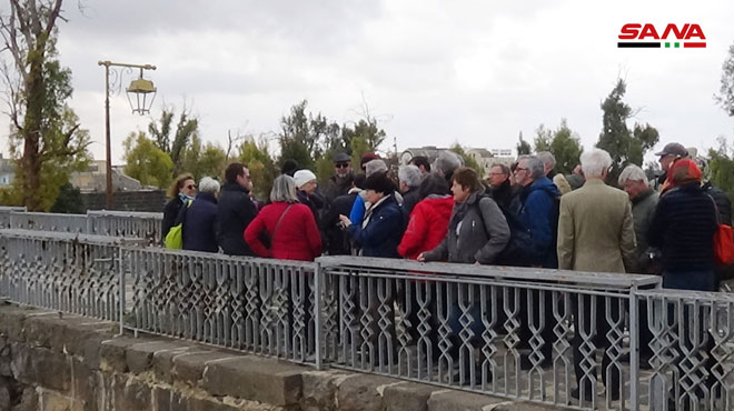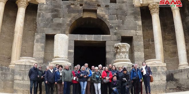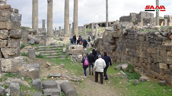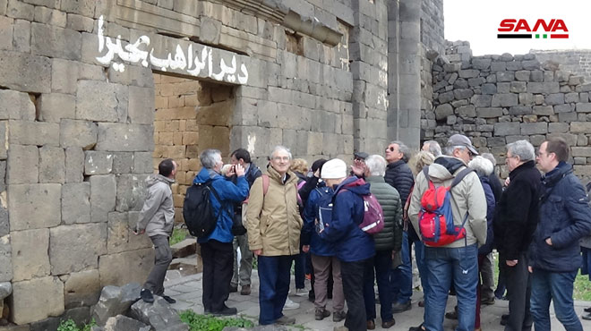 Un groupe touristique de plusieurs pays visite la ville archéologique de Bosra