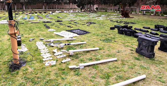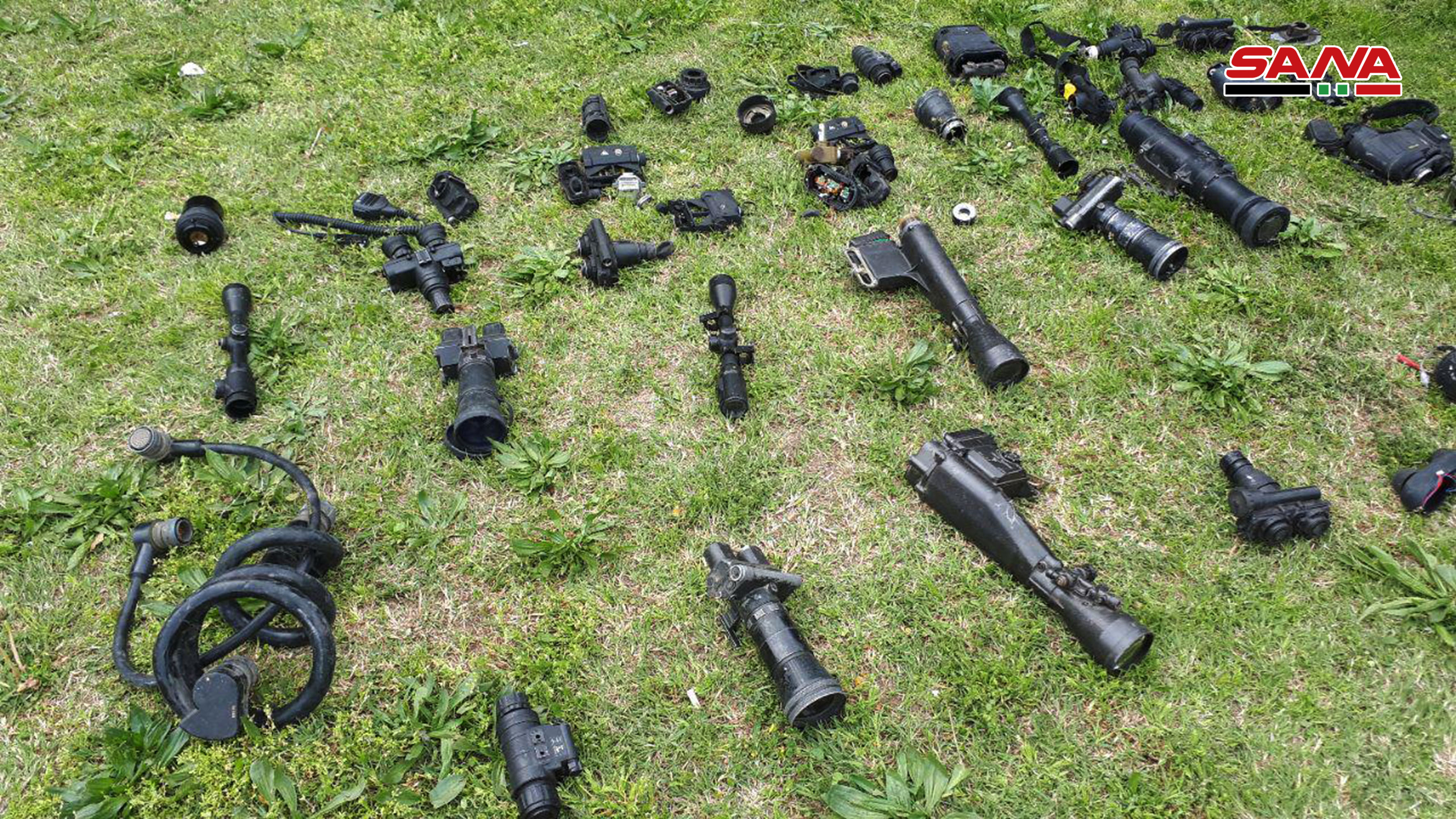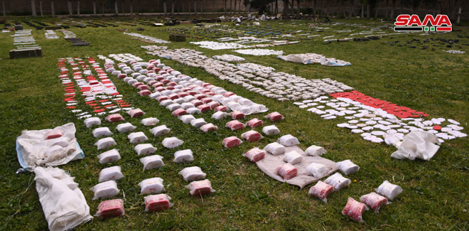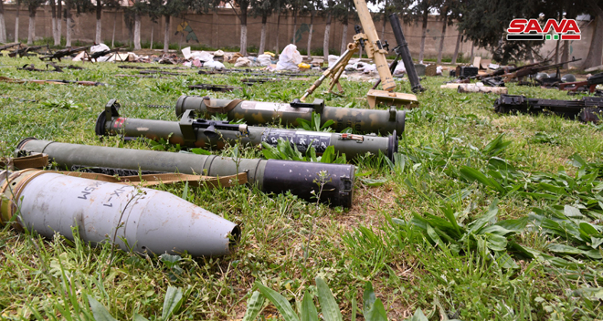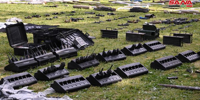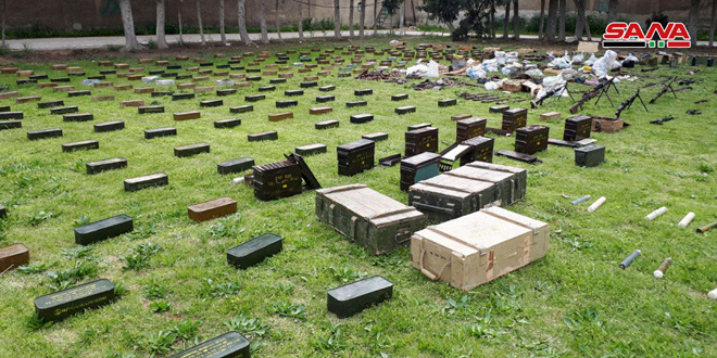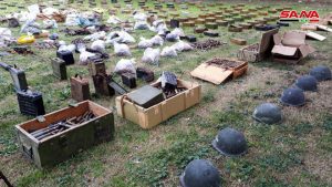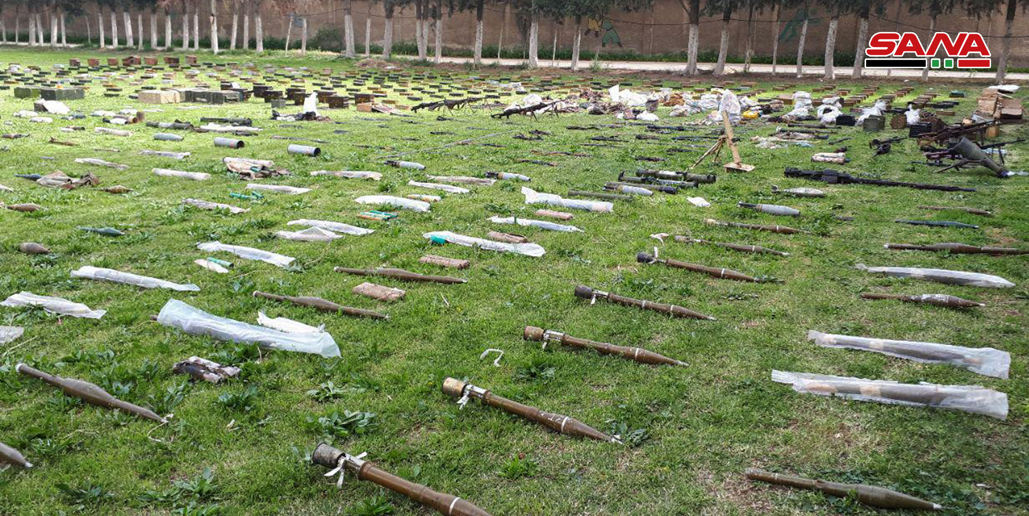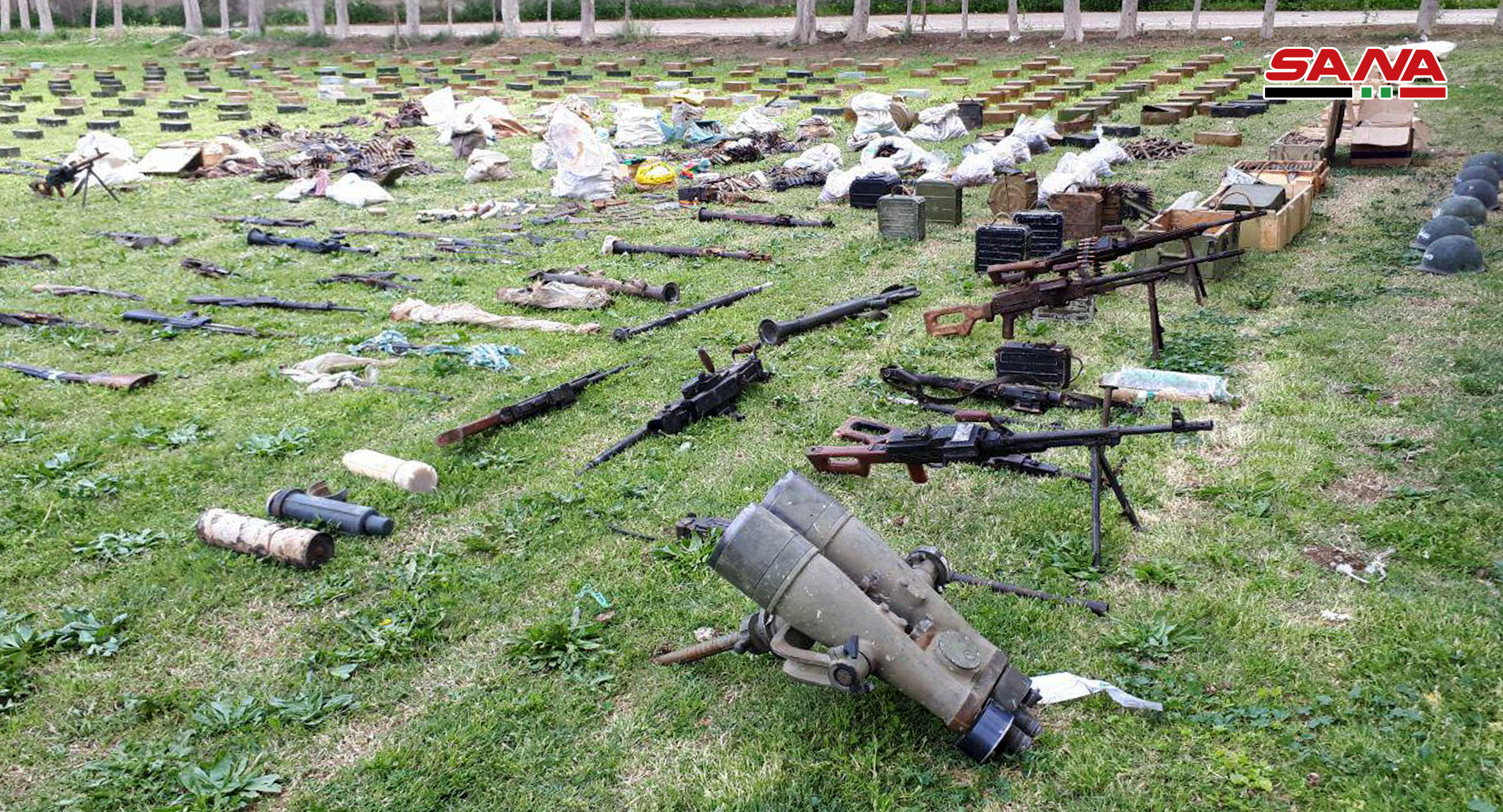 Damas-SANA / Ratissant les zones purifiées par l’armée arabe syrienne du terrorisme, les services compétents ont découvert dans les banlieues de Homs, Daraa et Damas un système de télécoms satellitaire de fabrication israélienne et de grandes quantités d’armes et de munitions occidentales et américaines abandonnés par les terroristes, ainsi que des stupéfiants et des pièces antiques volés et préparés à la contrebande hors du pays.