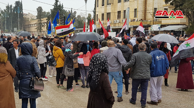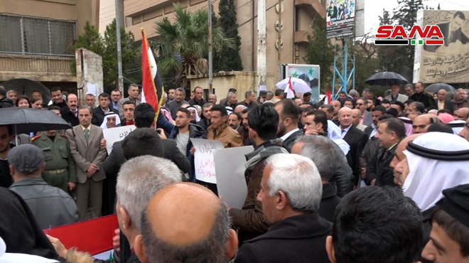 Hassaké – SANA / Les habitants de Hassaké ont observé aujourd’hui un sit-in dans le centre de la ville en condamnation des déclarations hostiles de Trump sur le Golan arabe syrien occupé.