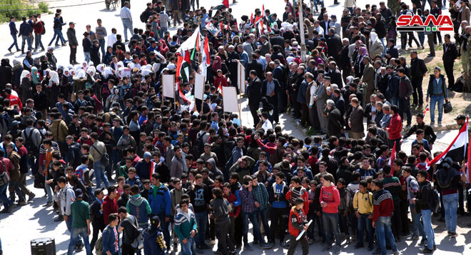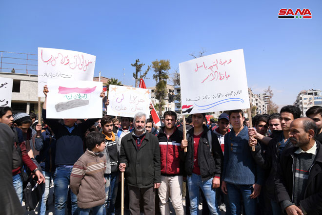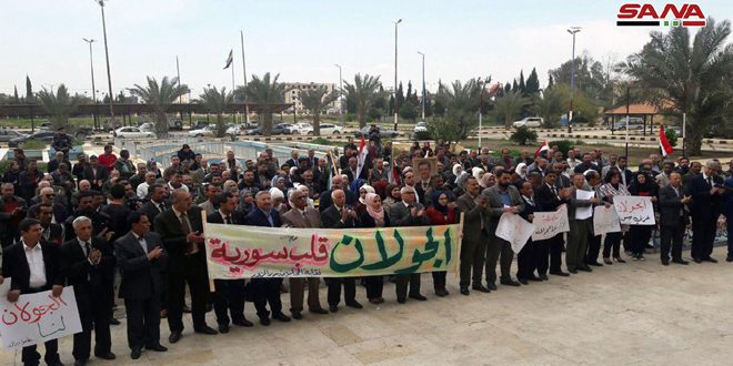 Gouvernorats – SANA/ Les sit-in de protestation se poursuivent dans nombre de gouvernorats en signe de condamnation et de refus de la proclamation du président américain Donald Trump sur le Golan syrien occupé.