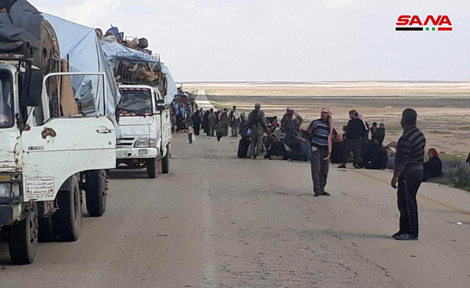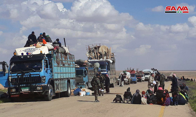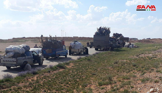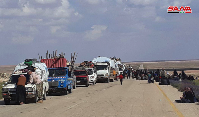 Homs -SANA/ Des dizaines de familles syriennes déplacées, venant du camp de Rukban où les forces américaines et leurs mercenaires de terroristes séquestrent des milliers de civils, sont arrivées au corridor de Jleighem dans le désert syrien.