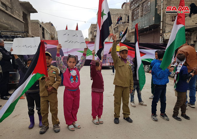 Gouvernorats – SANA/ Les forces, commissions et personnalités palestiniennes et syriennes dans le camp de Sbeina ont organisé aujourd’hui une marche pour commémorer la Journée de la terre et un sit-in contre la proclamation du président américain, Donald Trump, sur le Golan syrien occupé.