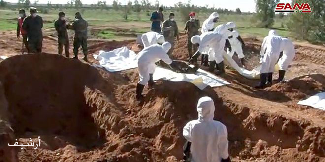 Raqqa-SANA/ Deux cents dépouilles environ de citoyens exécutés par les terroristes de “Daech” avant leur expulsion, avaient été enlevées d’une fosse commune découverte dans la périphérie du camp des pionniers dans la ville de Raqqa.