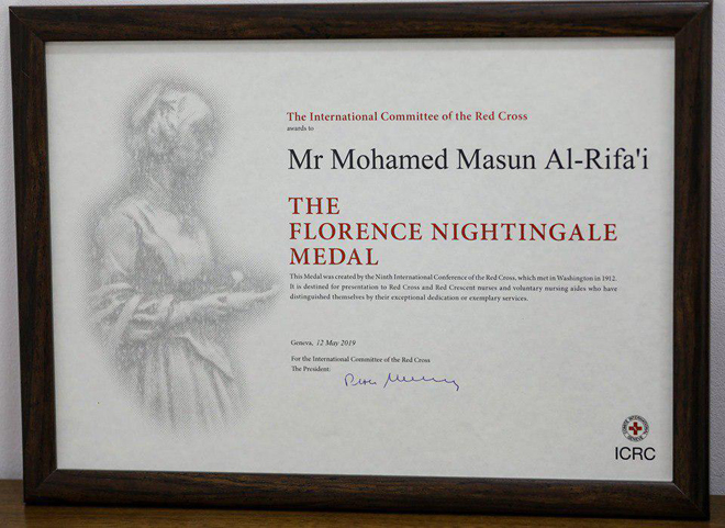 Dans un communiqué, le Croissant-Rouge arabe syrien fait noter qu’il avait présenté la candidature d’Al-Rifa’i parce qu’il est un ambulancier actif durant la crise et en signe d’appréciation de ses efforts et ses sacrifices.
