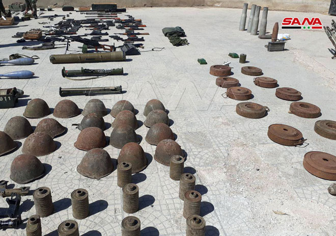 Découverte d’armes, de munitions et d’appareils de télécoms abandonnés par les terroristes dans la localité de Harra dans la banlieue de Daraa