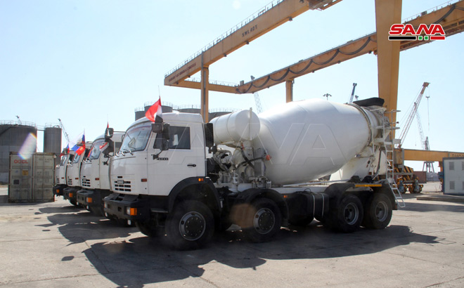 Tartous-SANA / Le ministère des Travaux publics et de l’Habitat a reçu la 1ère partie des véhicules de la société russe « Stroyekspert » pour combler le manque dans les sociétés de construction du fait des attaques terroristes.