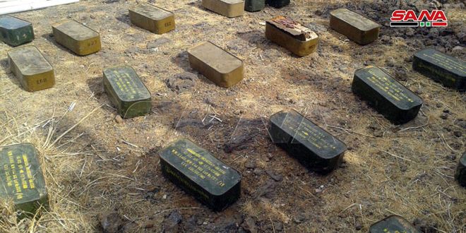 Soueidaa-SANA / Les services compétents ont découvert aujourd’hui un dépôt de munitions abandonnés par les réseaux terroristes dans la zone rocheuse Lajat dans la banlieue nord-ouest de Soueidaa.