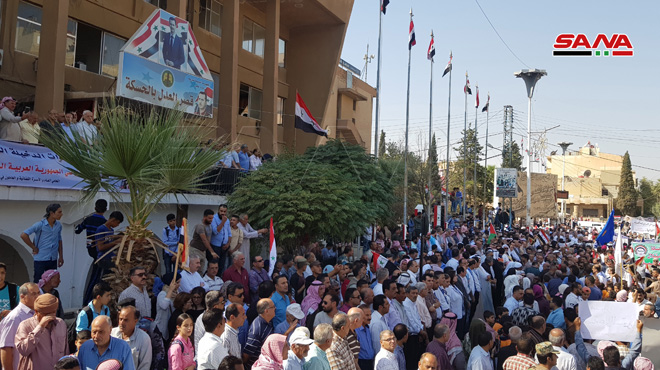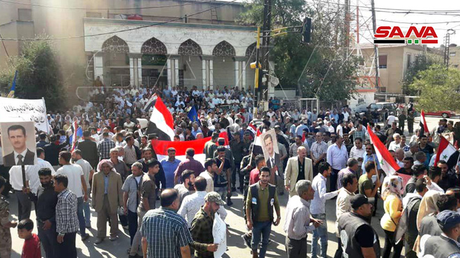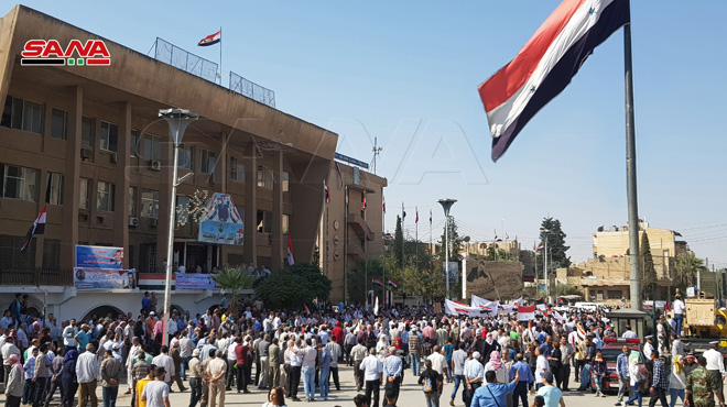 Les habitants, qui ont participé aux sit-in, ont affirmé leur rejet de toute présence illégale sur le territoire du gouvernorat, faisant savoir que l’armée arabe syrienne est la seule garantie capable de protéger l’unité des territoires syriens.
