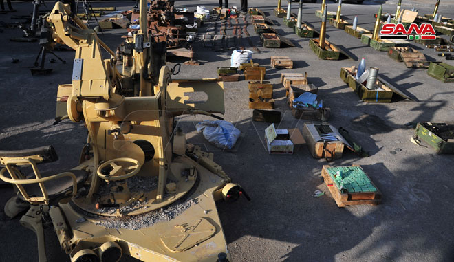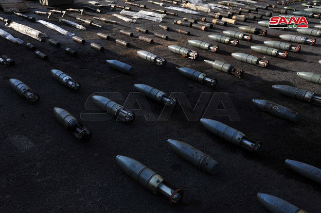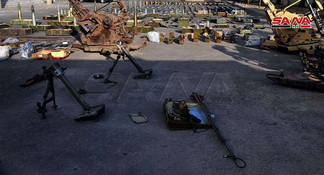 Banlieue de Damas -SANA /Dans le cadre de leurs missions d’achever la sécurisation des zones libérées par l’armée arabe syrienne du terrorisme, les services compétents ont saisi une grande quantité d’armes et de munitions abandonnées par les terroristes dans la région sud.