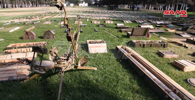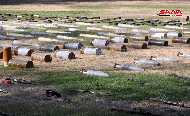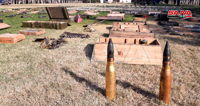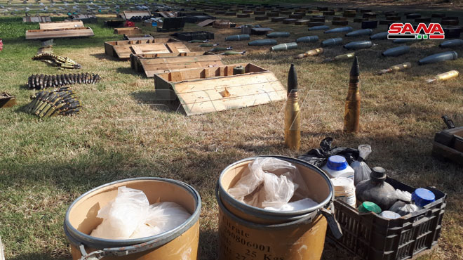 Dans une déclaration à SANA, une source des services compétents a indiqué qu’en collaboration avec les habitants, les services compétents avaient saisi une grande quantité d’armes, de munitions et d’agents toxiques utilisés dans la fabrication des armes chimiques, abandonnés par les terroristes dans les banlieues de Damas, Hama et Daraa.