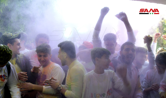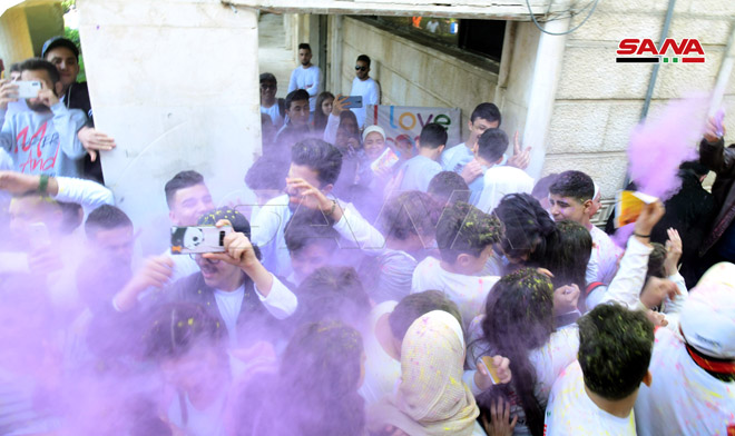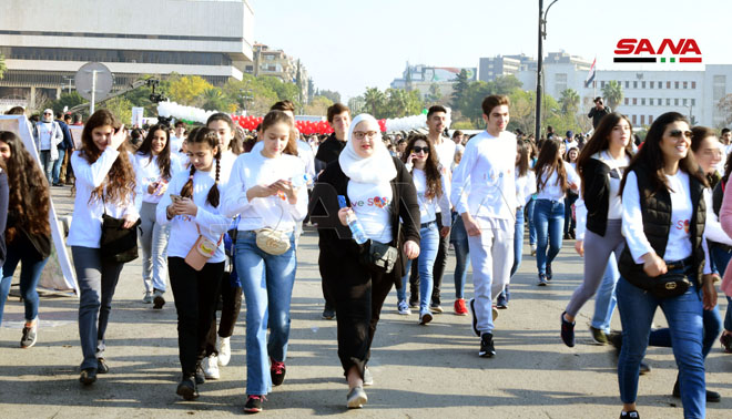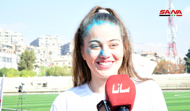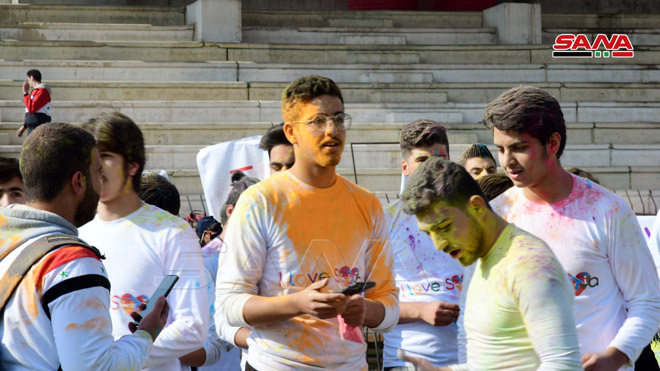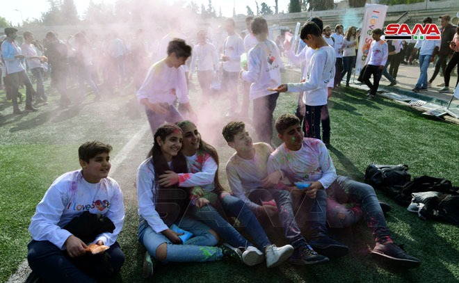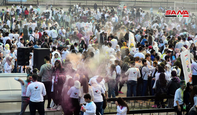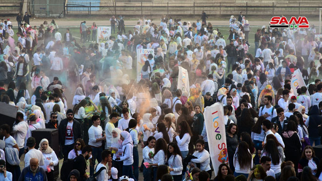 Damas – SANA/ Sous le titre ‘’J’aime la Syrie’’ , un marathon sportif de couleurs a été lancé aujourd’hui avec la participation d’environ 3000 jeunes hommes et femmes de Damas et d’autres zones, afin de transmettre au monde un message de joie, d’affection et de paix.