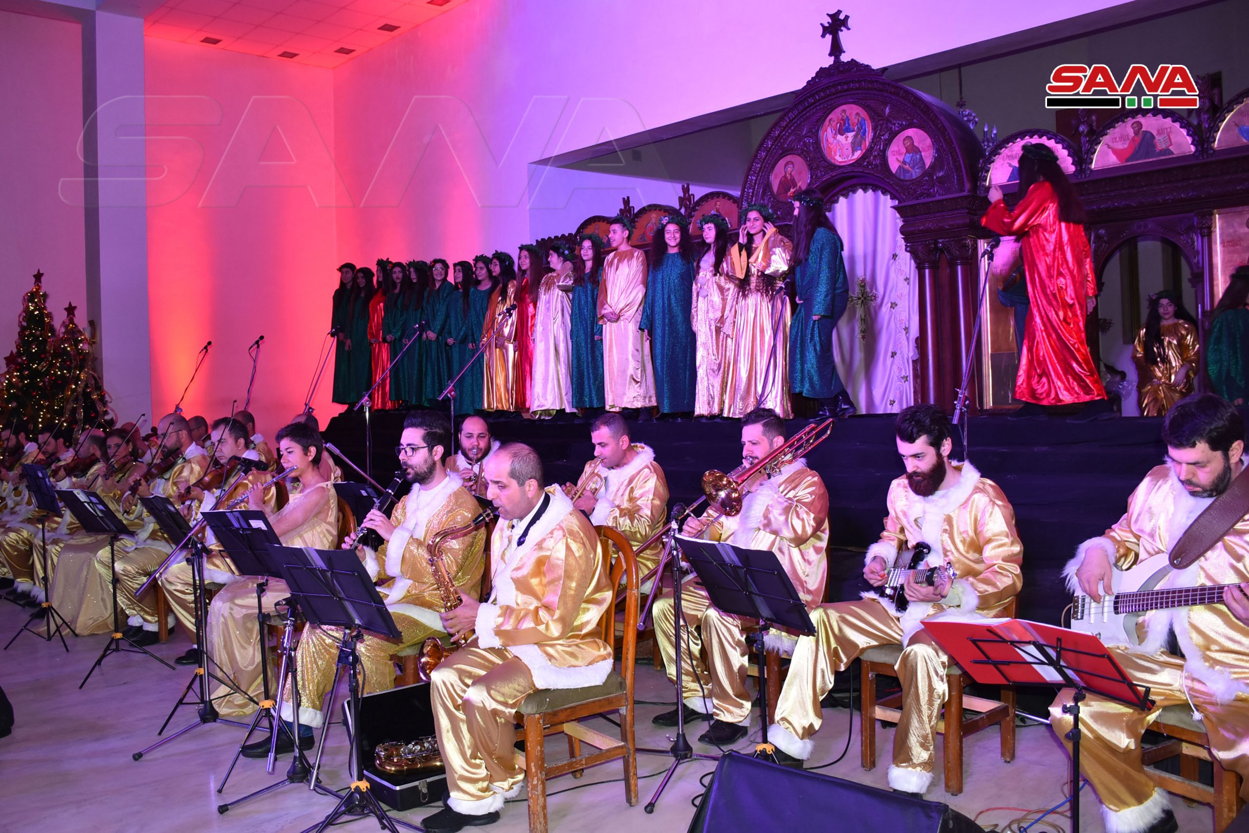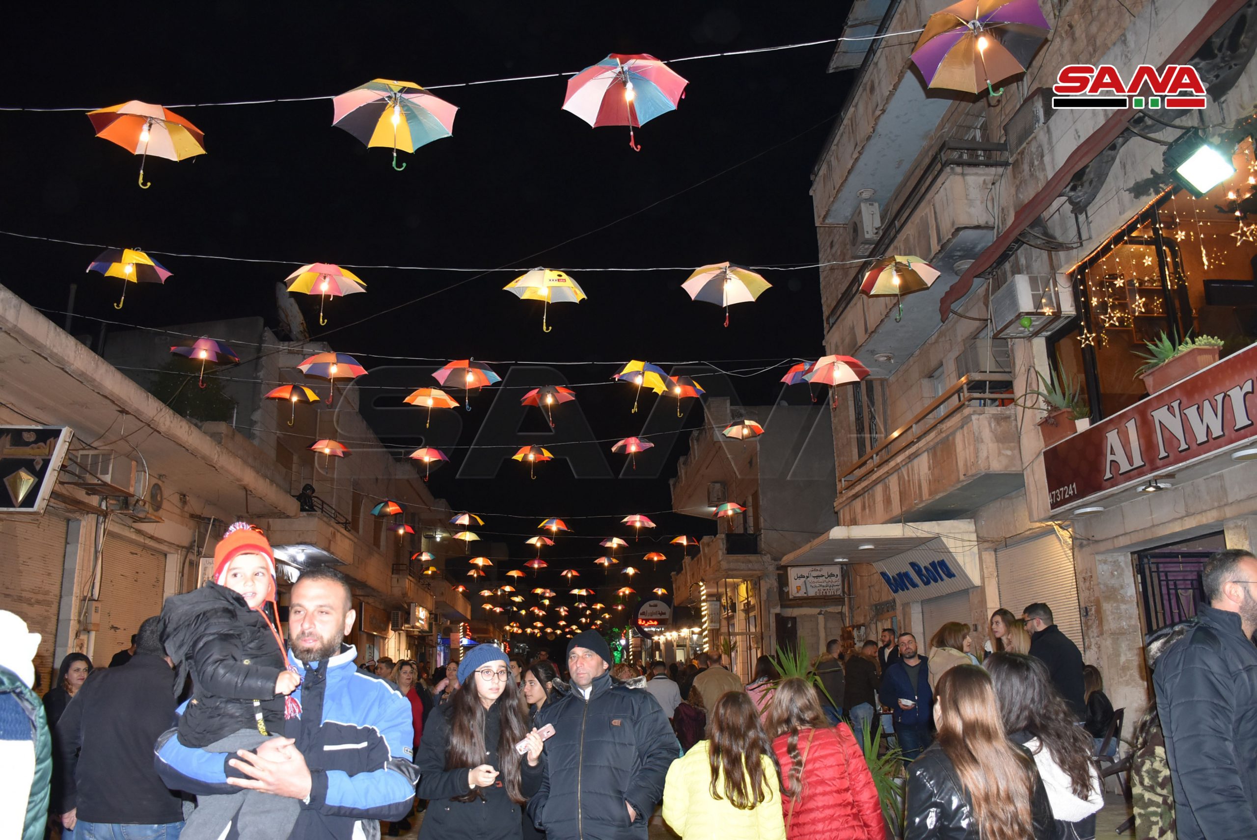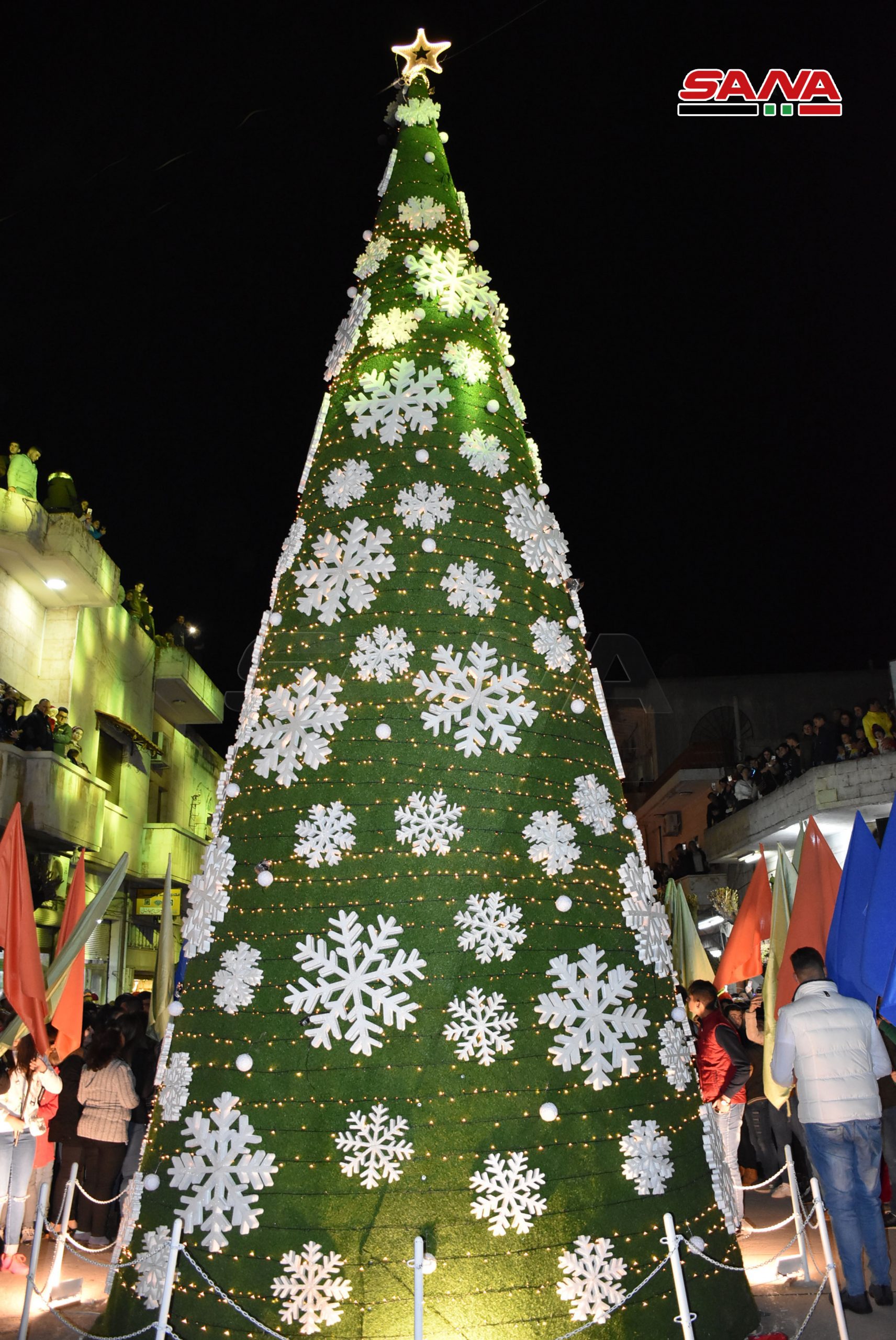 Hama-SANA / Des célébrations ont eu lieu aujourd’hui pour illuminer le sapin de Noël dans la rue de l’église Saint-Joachim des Grecs Orthodoxes à Mharda dans la banlieue de Hama.