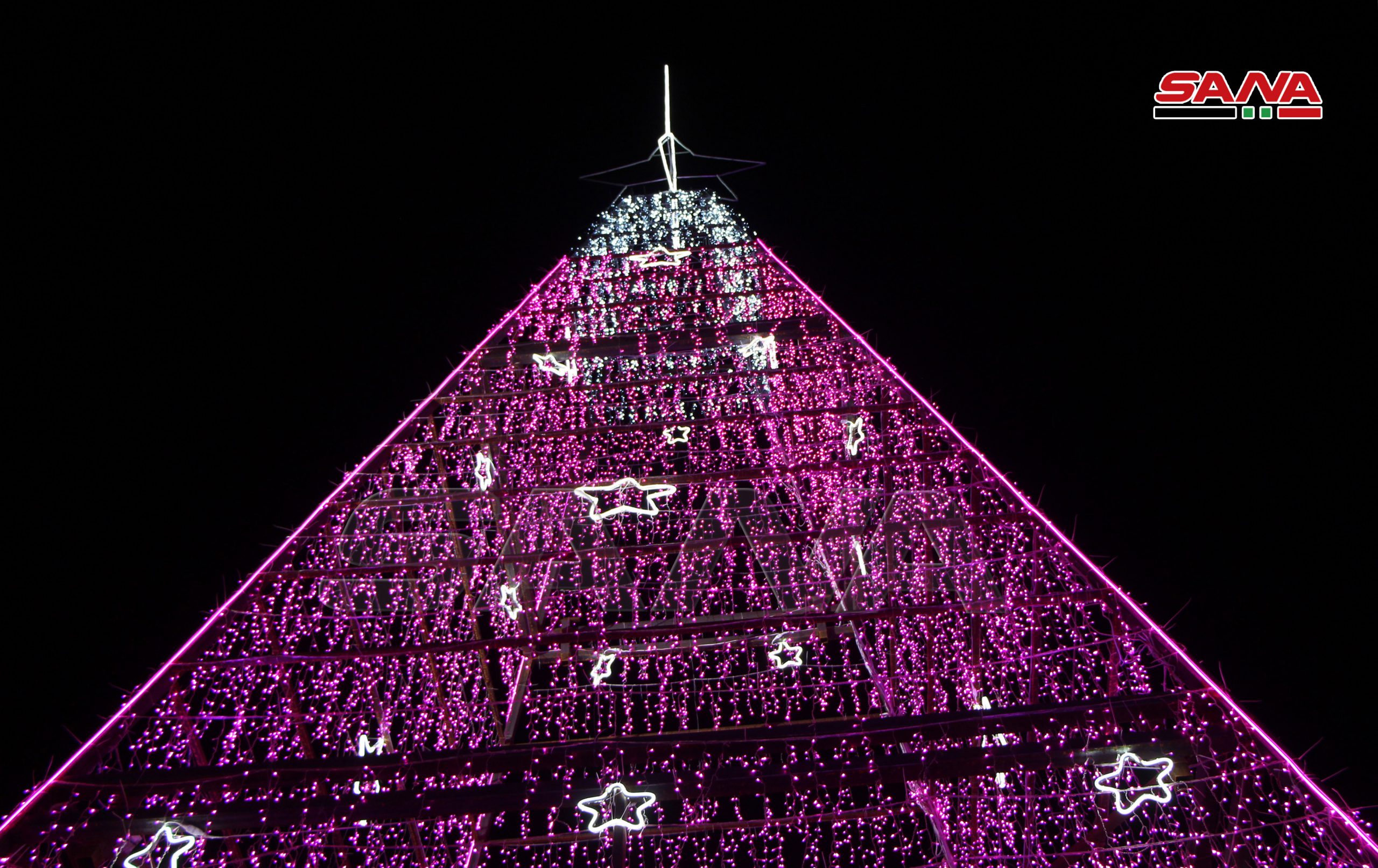 Daraa-SANA / Le sapin de Noël le plus grand a été illuminé aujourd’hui dans la localité de Bassir dans la banlieue de Daraa sous le titre « Arbre de la patrie ».