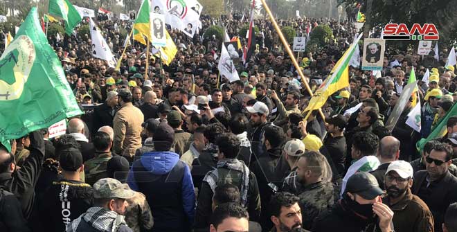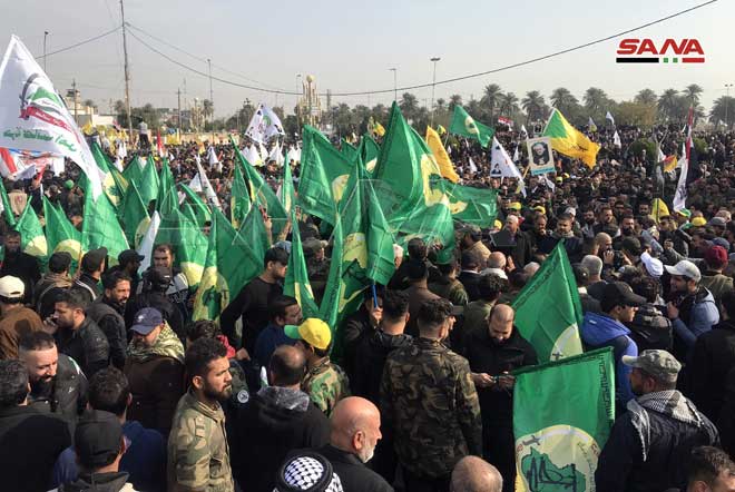 Bagdad-SANA/ Des milliers d’Irakiens ont participé aujourd’hui aux obsèques du lieutenant-général Qassem Soleimani, commandant de la Force al-Qods des Gardiens de la révolution iraniens et du vice-président de la mobilisation populaire irakienne, Abou Mahdi al-Mohandes, tombés en martyr dans l’agression américaine survenue hier à Bagdad.