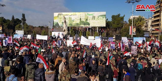 Alep – SANA / Un rassemblement populaire imposant a eu lieu aujourd’hui à la place de Saadallah al-Jabiri à Alep, en dénonciation du crime d’assassinat du lieutenant-général Qassem Soleimani qui est tombé en martyr vendredi dernier, avec Abou Mahdi al-Mohandes, vice-président des unités de la Mobilisation populaire, dans un crime commis par des drones américains près de l’aéroport international de Bagdad.