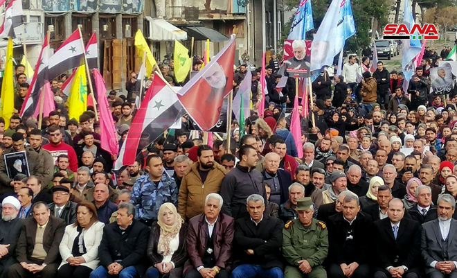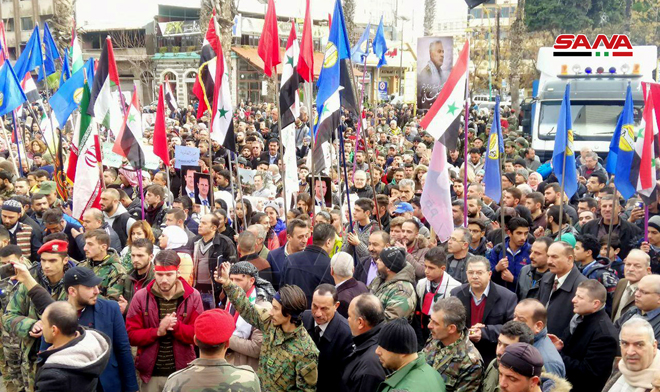 Homs -SANA / Un rassemblement populaire imposant a eu lieu aujourd’hui sur la place de Sa’a al-Jadida à Homs, en dénonciation du crime d’assassinat du lieutenant-général Qassem Soleimani qui est tombé en martyr avec Abou Mahdi al-Mohandes, vice-président des unités de la Mobilisation populaire, dans un crime commis par des drones américains près de l’aéroport international de Bagdad.