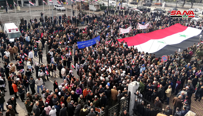 Lattaquié-SANA/ Un rassemblement populaire a été observé aujourd’hui sur la place de Mohafaza à Lattaquié pour condamner l’agression américaine perfide survenue à proximité de l’aéroport de Bagdad et qui a causé le martyre du lieutenant-général Qassem Soleimani, commandant de la Force al-Qods des Gardiens de la révolution iraniens, et d’Abou Mahdi al-Mohandes, vice-président des unités de la Mobilisation populaire.
