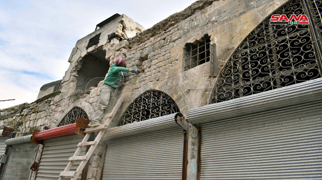 Alep-SANA / Dans le cadre des efforts colossaux faits pour redonner de l’éclat aux souks dans la vieille ville d’Alep, les travaux de la réhabilitation et de la restauration du souk de Khabya, endommagé par les terroristes et qui comprend plus de 100 magasins, se déroulent avec des pas accélérés.