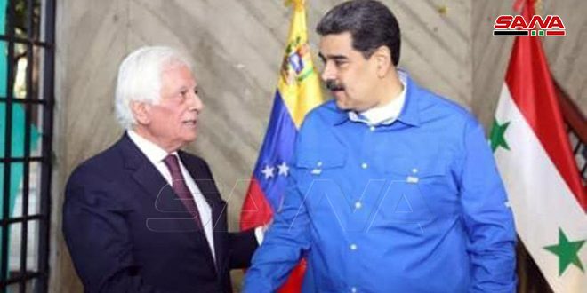 Caracas-SANA / Le président vénézuélien, Nicolas Maduro, a reçu Mohsen Bilal, membre de la Direction centrale du Parti Baas arabe socialiste, dans la capitale vénézuélienne, Caracas, en marge de la « Rencontre mondiale anti-impérialiste pour la vie, la souveraineté et la paix ».