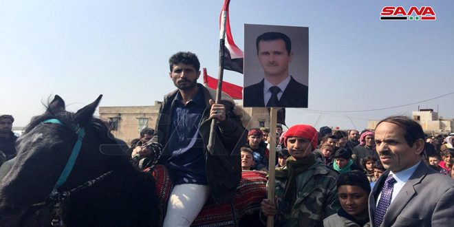 Les participants au rassemblement ont affirmé leur rejet de toute présence sur la terre syrienne, disant « nous n’acceptons que la présence de l’armée arabe syrienne sur notre terre et le drapeau syrien et le seul drapeau que nous hissons ».