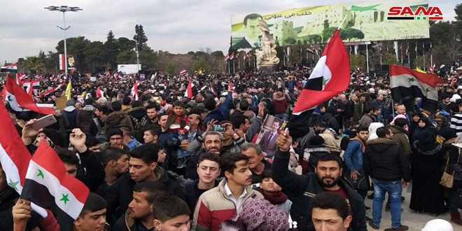 Alep – SANA/ Le correspondant de SANA a fait noter qu’un rassemblement populaire imposant a été observé aujourd’hui sur la place de Saad Allah Jaberi à Alep pour célébrer les victoires de l’armée arabe syrienne.