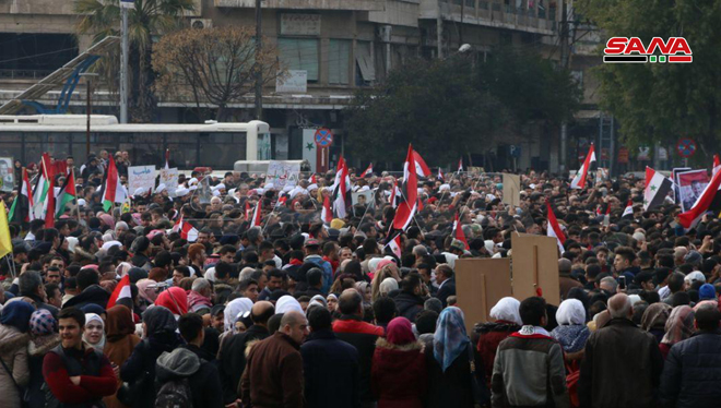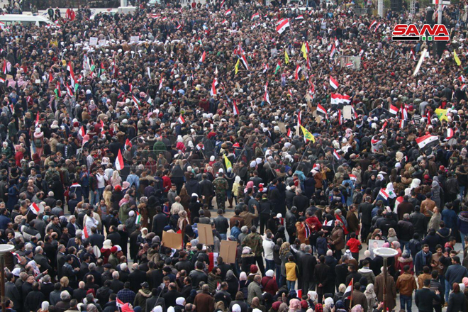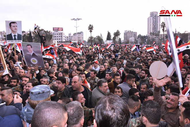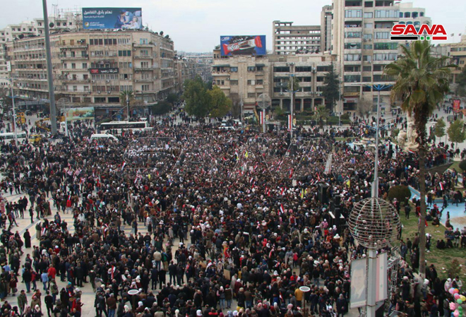 Alep-SANA / Un rassemblement populaire imposant a été organisé sur la place de Saadallah Jaberi pour célébrer les dernières batailles menées par les héros de l’armée arabe syrienne contre les réseaux terroristes dans les deux banlieues ouest et nord-ouest d’Alep et l’expulsion du terrorisme de la périphérie de la ville.