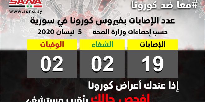 Dans un communiqué, dont une copie est parvenue à SANA, le ministère a fait noter que trois nouveaux cas de coronavirus avaient été enregistrés en Syrie, pour que le nombre atteigne 19, dont deux cas ont été guéris et deux sont morts.